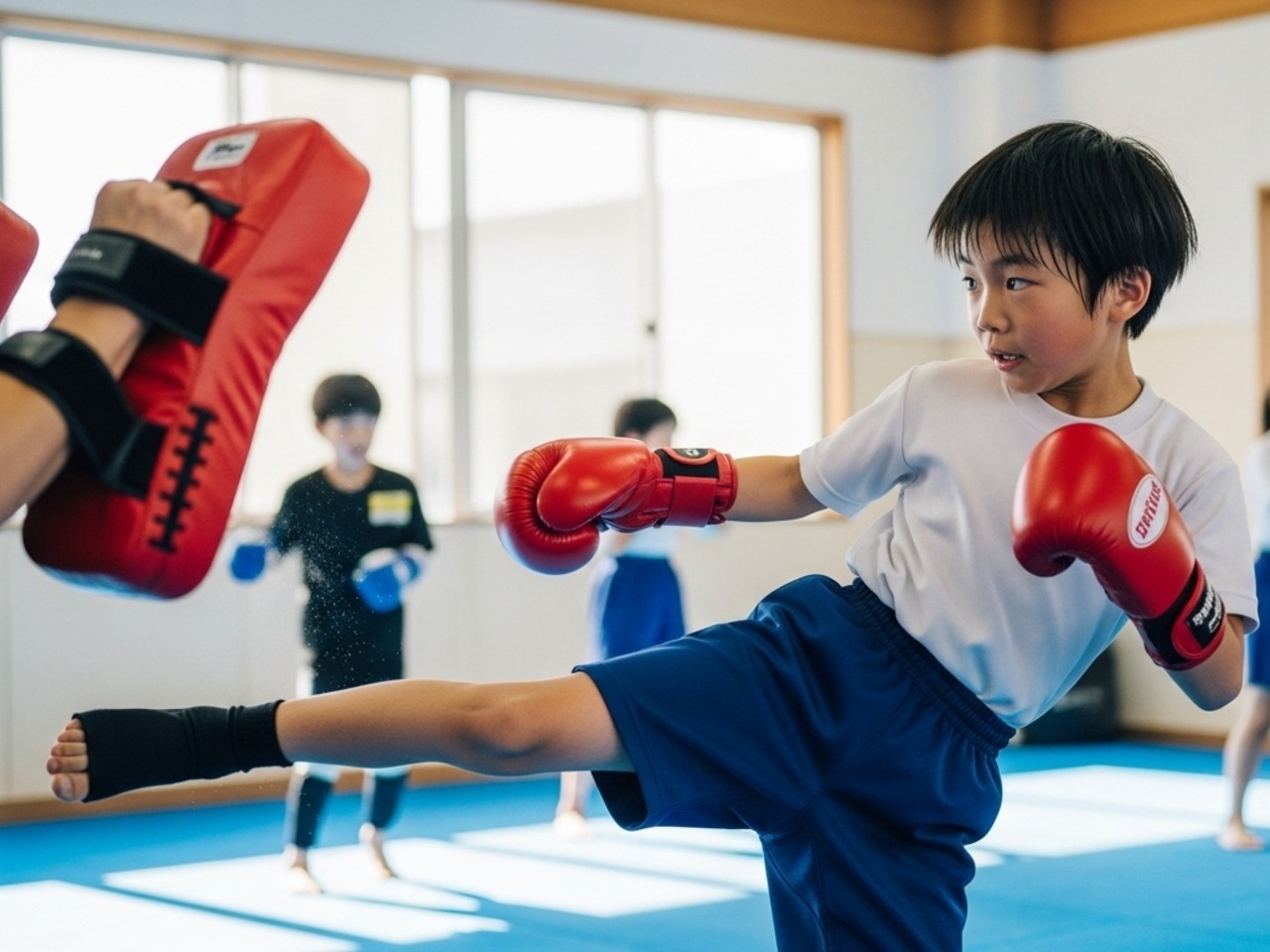 4才~小2(幼年)と小3~小6(少年)の年齢別でキックボクシングの指導を行います。心構えと身構え、礼節を尊び、信義を重んじ、自制力が養えます。